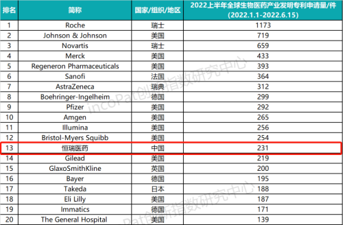 专利是药企最有价值的资产之一,是企业发展的基石,对做原创创新的企业尤为重要。全球专利数据库incoPat创新指数研究中心对2022年1月1日至2022年6月15日公开的全球生物医药产业发明专利申请数量进行统计排名,生物医药产业专利涉及生物技术药、基因工程药物、疫苗、诊断试剂、微生态制剂、血液制品等技术领域。入榜企业/医院主要来自13个国家、组织或地区,罗氏、强生、诺华分别位列前三,九游会j9医药(231件)排名第13位,领跑中国药企。