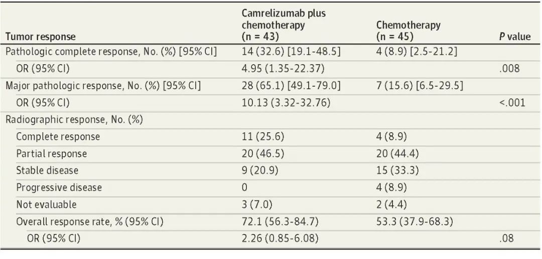 北京时间8月3日,九游会j9医药创新药卡瑞利珠单抗联合化疗(Cam+CT)对比化疗(CT)新辅助治疗ⅢA/ⅢB (T3N2) 期非小细胞肺癌(NSCLC)结果在线发表于国际权威期刊JAMA Oncology[1]。该研究是由空军军医大学唐都医院姜涛教授、雷杰教授团队联合陕西省肿瘤医院雷光焰教授团队、兰州大学第二附属医院王成教授团队共同参与的一项随机对照、多中心、Ⅱ期临床研究(TD-FOREKNOW,NCT04338620)。研究结果显示,与化疗相比,卡瑞利珠单抗联合化疗新辅助治疗NSCLC显著提高了病理完全缓解(pCR)率(32.6% vs 8.9%,OR=4.95,95% CI :1.35-22.37, P =0 .008),且安全性良好。本研究是卡瑞利珠单抗新辅助治疗可切除NSCLC患者的首个随机对照研究,为NSCLC新辅助免疫治疗再添新证。