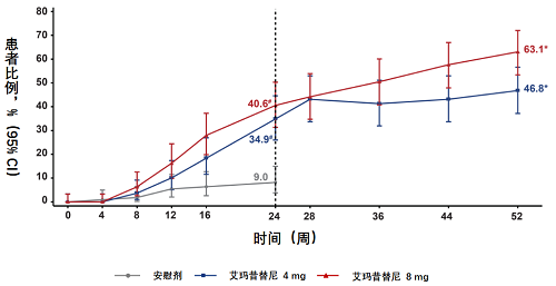 在核心期治疗中,试验组使用硫酸艾玛昔替尼片4 mg/8 mg治疗,安慰剂组使用安慰剂治疗。在24周之后至52周均使用硫酸艾玛昔替尼片维持治疗。研究的主要终点是评价24周时SALT评分≤20(表示头皮脱发≤20%)的患者比例。